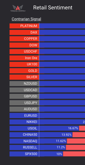 When retail positioning for an asset is above or below 60% (meaning 60% or more of retail traders are either long or short), it triggers a contrarian signal. If retail traders are 60% or more short on an asset, the EdgeFinder highlights a bullish contrarian setup, signaling that the asset might rise. Conversely, if retail traders are 60% or more long, it signals a bearish contrarian setup, suggesting potential downside.