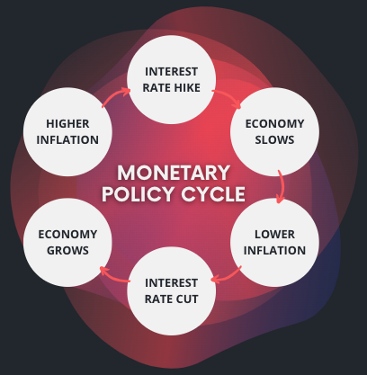 Monetary policy is a countercyclical process: Central banks adjust their policies to counteract economic cycles, aiming to stabilize the economy.