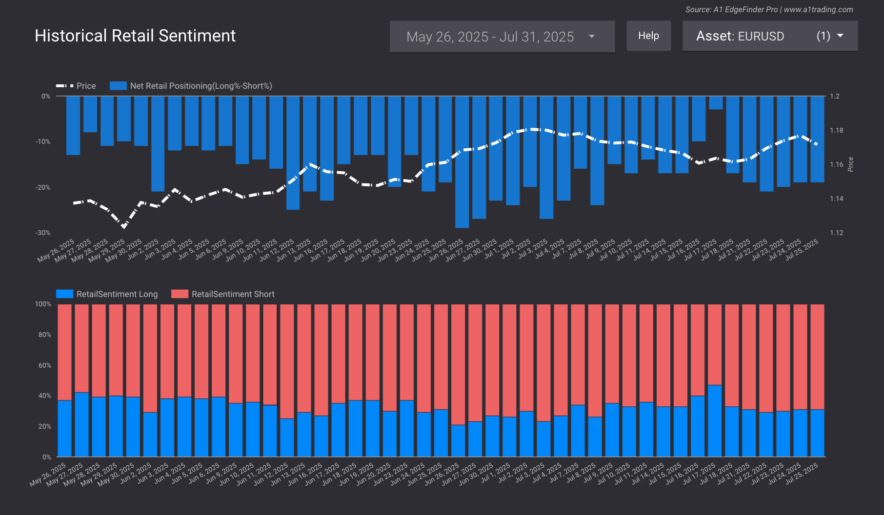 When retail positioning for an asset is above or below 60% (meaning 60% or more of retail traders are either long or short), it triggers a contrarian signal. If retail traders are 60% or more short on an asset, the EdgeFinder highlights a bullish contrarian setup, signaling that the asset might rise. Conversely, if retail traders are 60% or more long, it signals a bearish contrarian setup, suggesting potential downside.