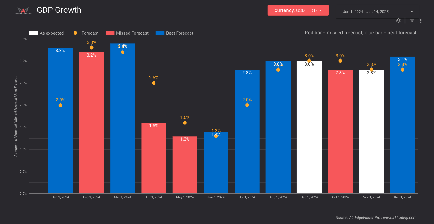 Markets move on surprises—not just raw data—so EdgeFinder highlights the difference between forecast and actual results, showing how the market is likely to react. For instance: